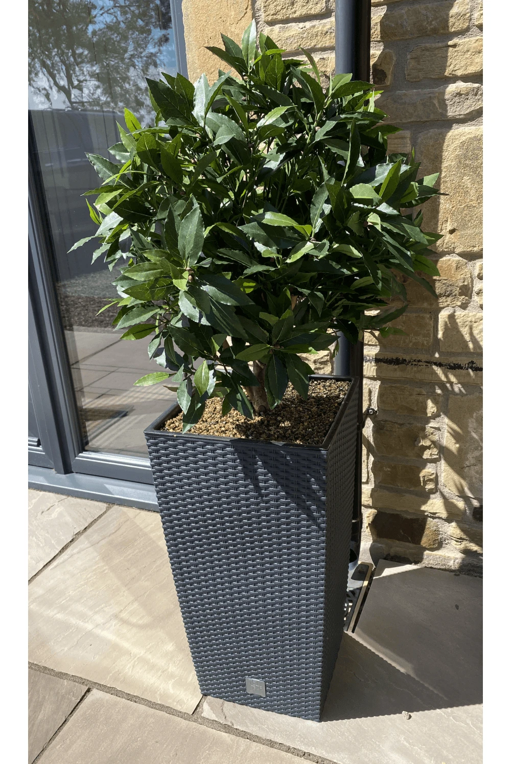 50cm diameter artificial bay leaf ball is then planted in a 60cm rattan planter. The ball is set in hard resin just above the planter.