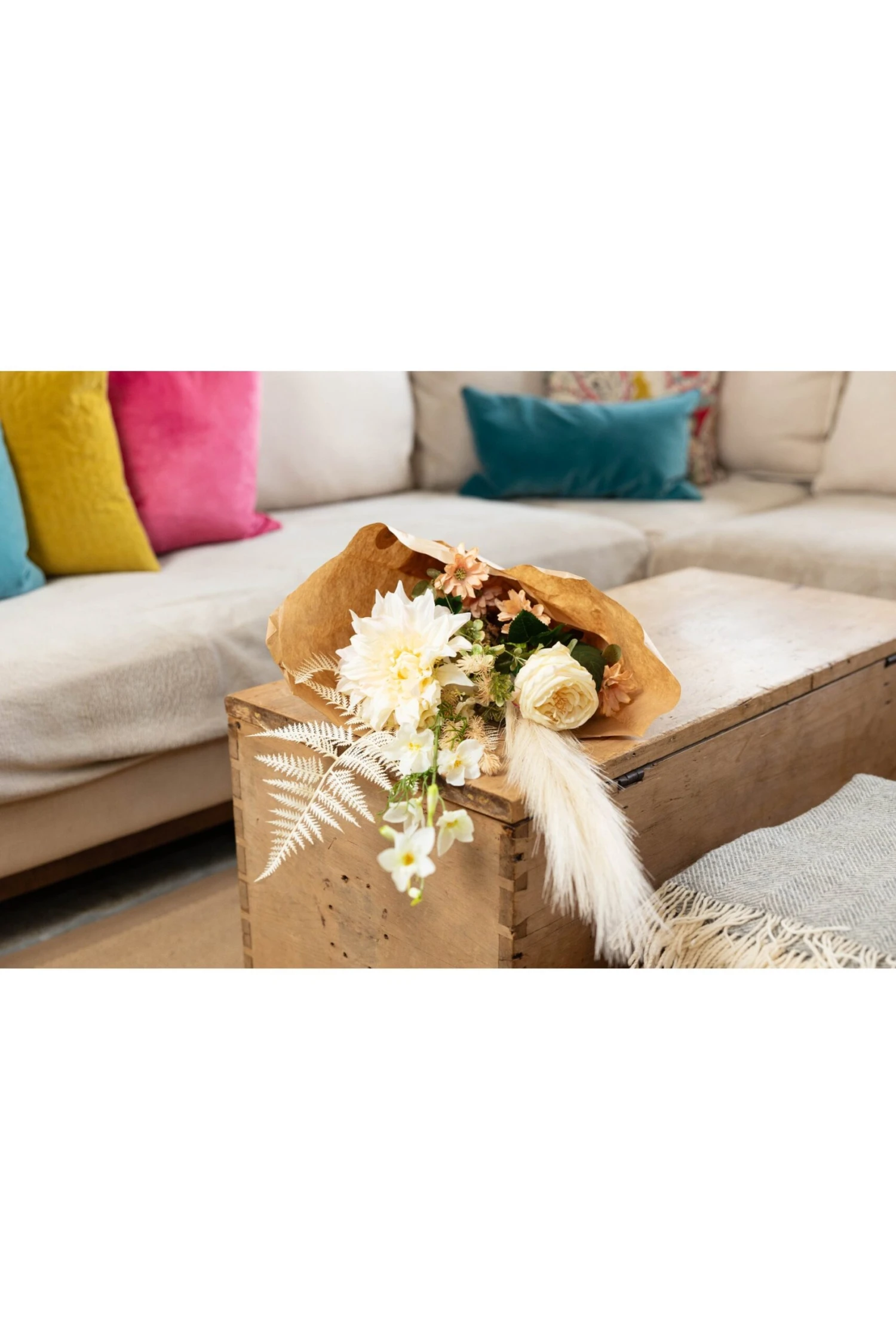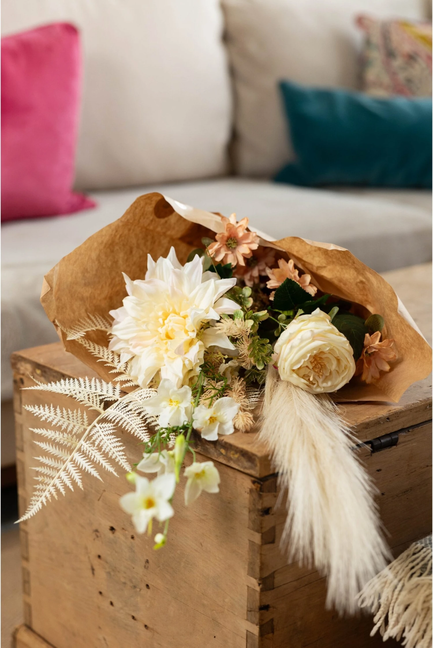 High quality hand tied artificial bouquet. Add year round beauty to your interior space with one of our beautiful bouquets. Hassle free nature in your space. The only maintenance required will be a rare dusting or blow with the hairdryer to remove any dust.