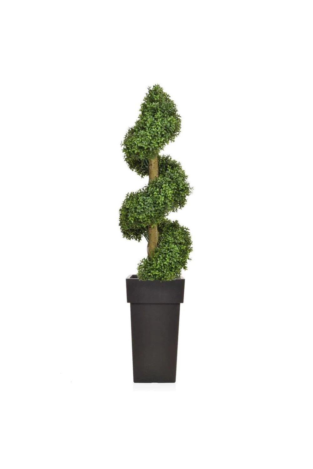 The artificial buxus spiral 1.5m tall in a dark grey lofty planter is a ready made display.