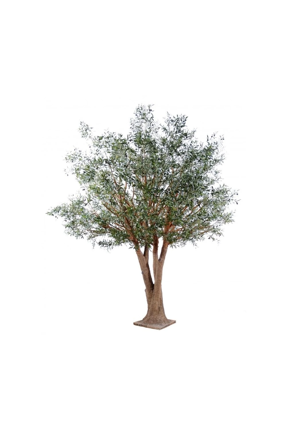 The 4.3m artificial olive tree has a 100cm x 100cm flat base plate and the foliage starts at 1.6m from the ground.