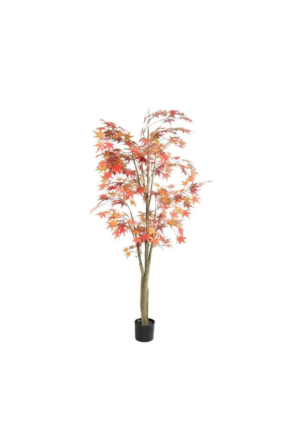 The artificial maple tree has autumn leaves and is made on an artificial stem.