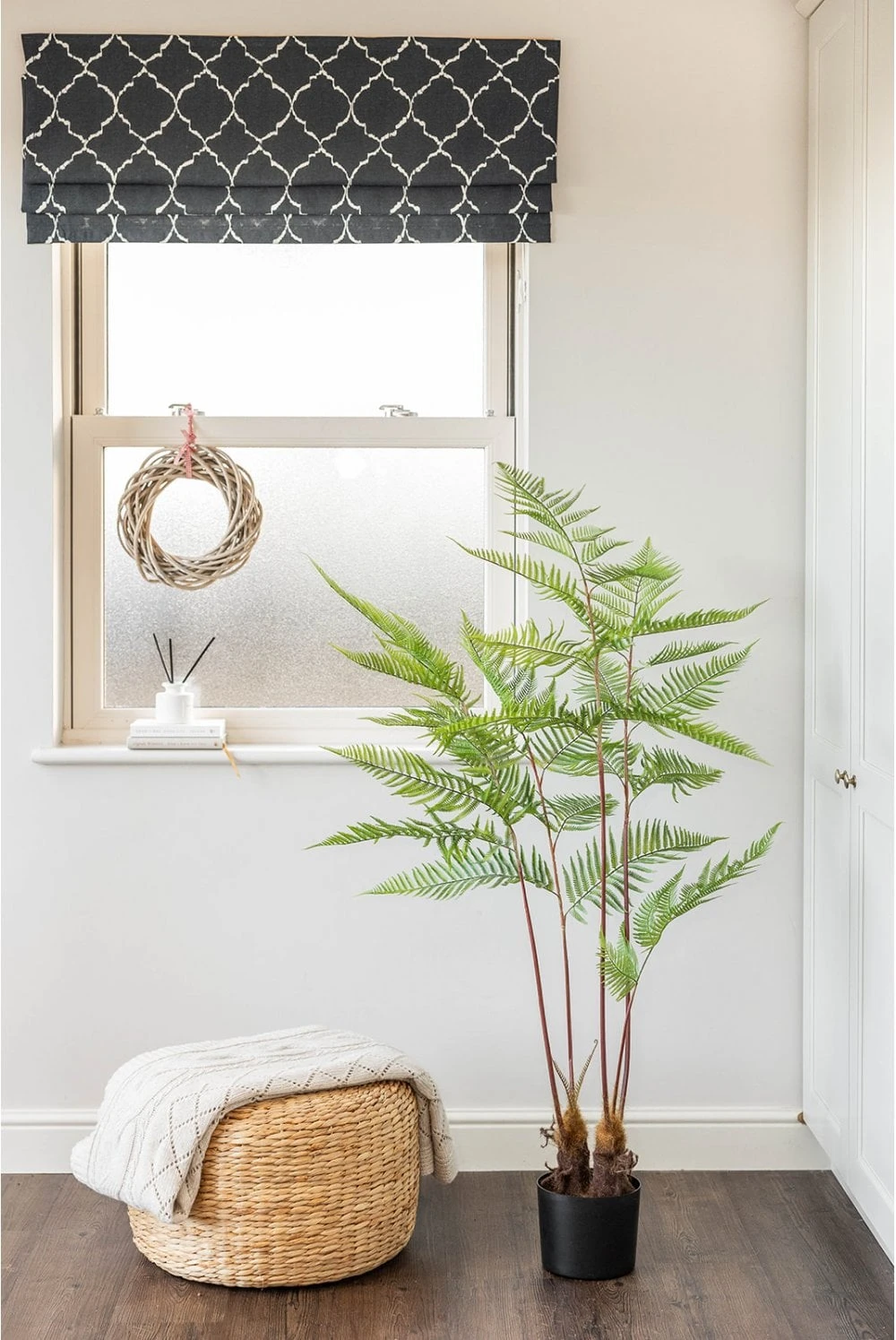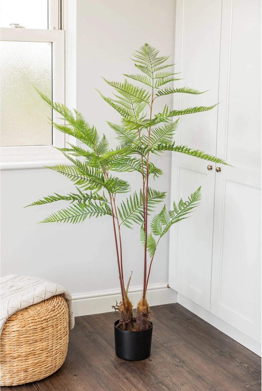 Introducing the Artificial Fern Tree, a stunning and lifelike palm standing at an elegant height of 145cm, perfect for enhancing any indoor space. Delicately crafted, this exquisite tree comes in a small Black Stabiliser base, measuring 15cm x 15cm. To fully showcase the ferns beauty, we recommend selecting a display planter of 30cm or larger. Its high-quality design guarantees a realistic and natural appearance, adding a touch of greenery and sophistication to your home or office decor.