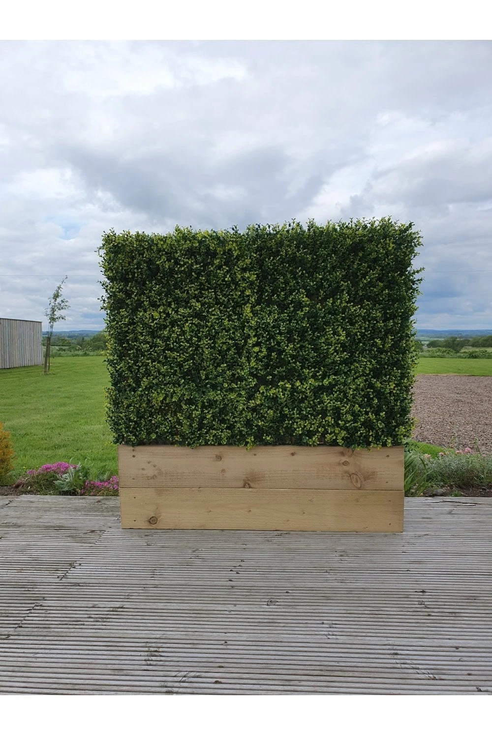 This artificial hedge is one of our best-selling products, a quick and easy way to add artificial boxwood hedging to your space! Our sizes are taken from the floor level at the bottom of the timber trough to the top of the hedge therefore the measurements are the overall sizes. This ready made artificial hedge can be sold in 3 trough colour options, Natural un painted, Painted Grey or Painted Black.
