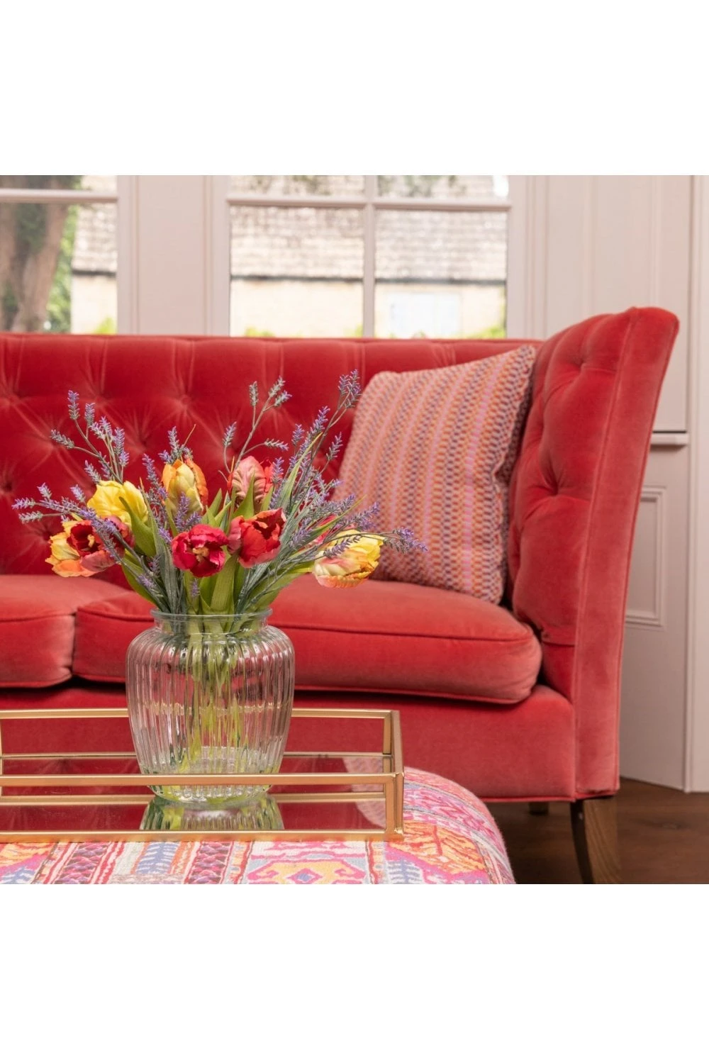 One of the new additions to our artificial floral displays. The captivating Tulip and Lavender Display! Crafted meticulously by hand, this arrangement boasts a delightful mix of vividly coloured tulips paired harmoniously with delicate lavender. Nestled within an exquisite glass vase, this lifelike ensemble stands at a height of 36cm with a width spanning 30cm, making it a perfect centrepiece to infuse everlasting beauty into any space. Experience the charm of nature’s elegance without the worry of maintenance.